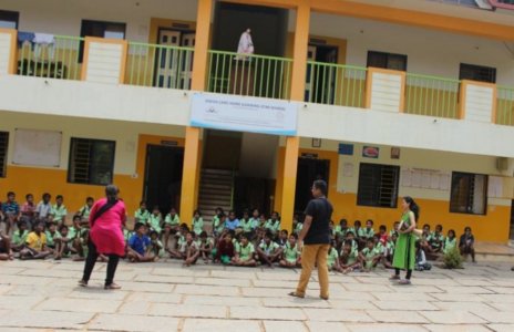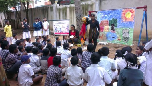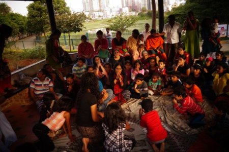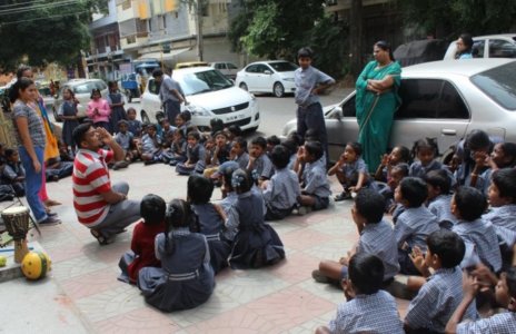 This year we reached out to at least 1000 children and adults. We began this journey with visiting the apartment communities of some of our children and taking the story to government schools, old age homes, orphanages, organisations working with children at high risk. ‘A boy and his drum’ took a journey quite its own into the realm of drama, songs, drum beats; each aspect infusing fresh energy that did not let the tale get stale for the audience and especially the storytellers who reinvented with each telling. We took the story to Hulimavu Government school , SJR Luxuria , Snehadhaan, Mantri Residency,Shiva Bala Yogi Old Age home, Sunbeam, Child Fund Association and Meenakshi Residency.