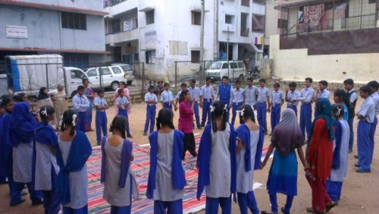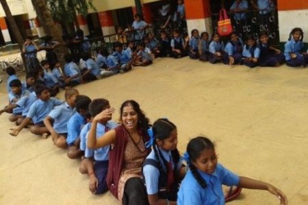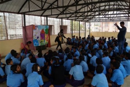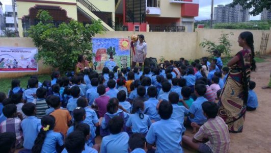 We set out with a story, a pot-puppet, drums and a couple of songs, to reach out to schools and organisations around South Bangalore. The book chosen for this year’s campaign was ‘Paplu, the Giant’ – written by Ramendra Kumar and Illustrated by Zainab Tambawalla. Paplu, the giant was our teacher’s day gift to the lives of many who have shown us ways of seeing and learning. Paplu travelled to Jayanagar Parent Association, Mysore Educational Welfare society, Brindavan Education Trust, Belaku Shishu Nivasa, BMES Byrasandra and the government school in Uttarahalli.