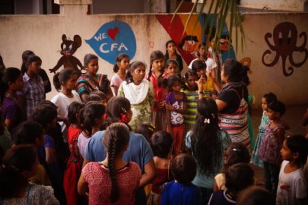 Stories live when told. The story telling event at the Puttenhalli brought alive ‘Sringeri Srinivas’ from a popular story, The Annual Haircut, to about 90 children in the school. The lead up to the event saw a voice session with the children of the school as the children from the centre prepared the props for the event.