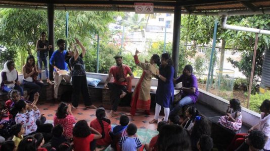 This year, we are so stoked to be back with Pratham books and PNLIT to rejoice in an online storytelling session. We had double the fun this time bringing to over 65 children from across the country not one, but two stories delivered online through an interactive session. The Girl who could not stop laughing and the Angry Akku enthralled the group and kept them asking for more. Each year we set out with a story, drums and songs, to reach out to schools and organisations around South Bangalore. This year our intent to use the arts in myriad possibilities, whether to build acceptance or make connects within communities beautifully manifested online.