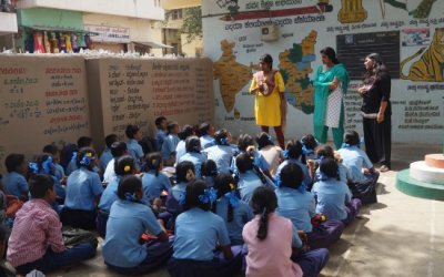 We began a programme association with Riddhi Foundation, to focus on using multi-art forms and technology to enrich learning within classrooms for children at the Hulimavu Government School, Bangalore. The various artistic tools to be used include: Music – Voice and Rhythm, Dance and movement, Stories – sharing and creating, Visual arts, Theatre and drama, puppetry and role plays. The aim was to create a platform for peer and socio-cognitive learning.