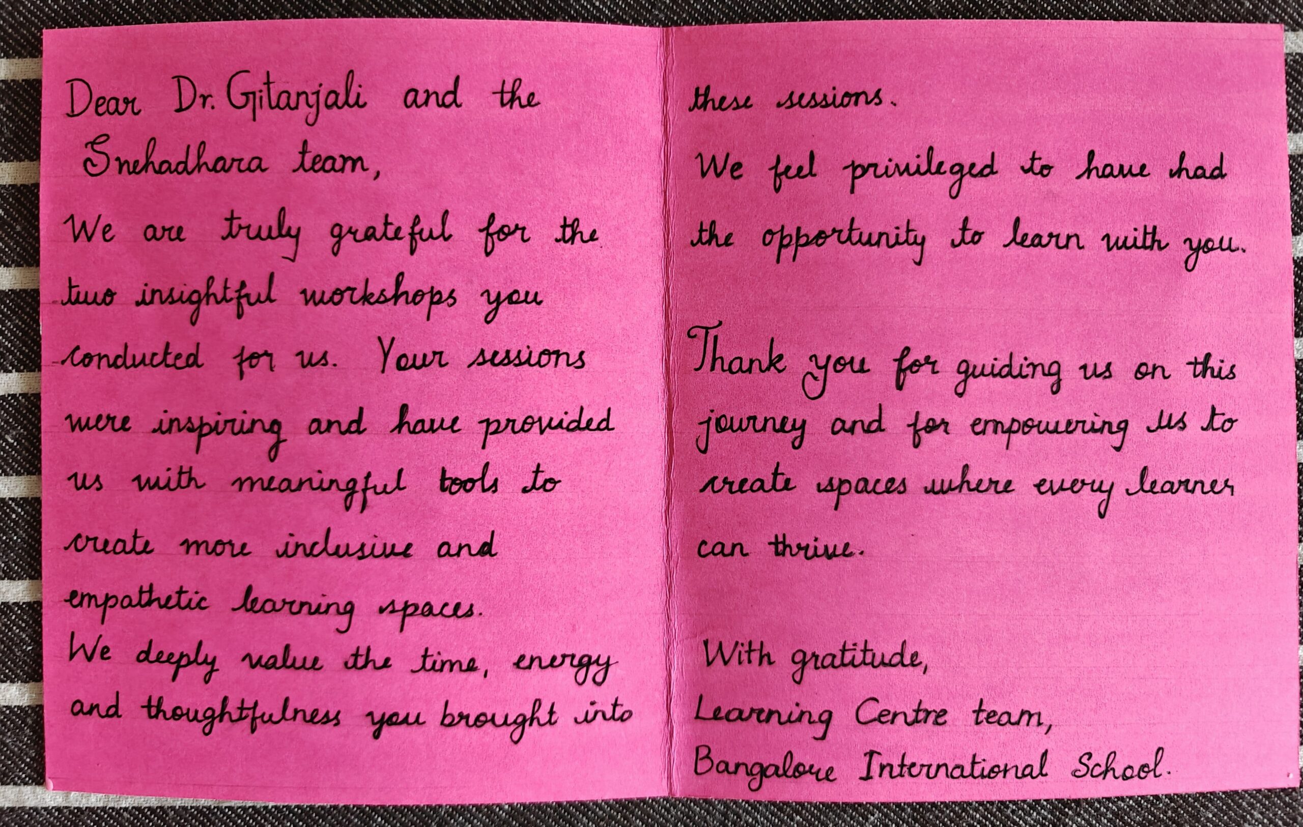 The training session at Snehadhara Foundation, facilitated by Dr. Gitanjali G Govindrajan, was truly one of a kind. As we embark on our 10th-year journey, we reached out to Gitu with the many pain points we’ve been carrying, recognizing the need to pause, reflect, and revisit some core issues essential for sustaining and strengthening our organization.